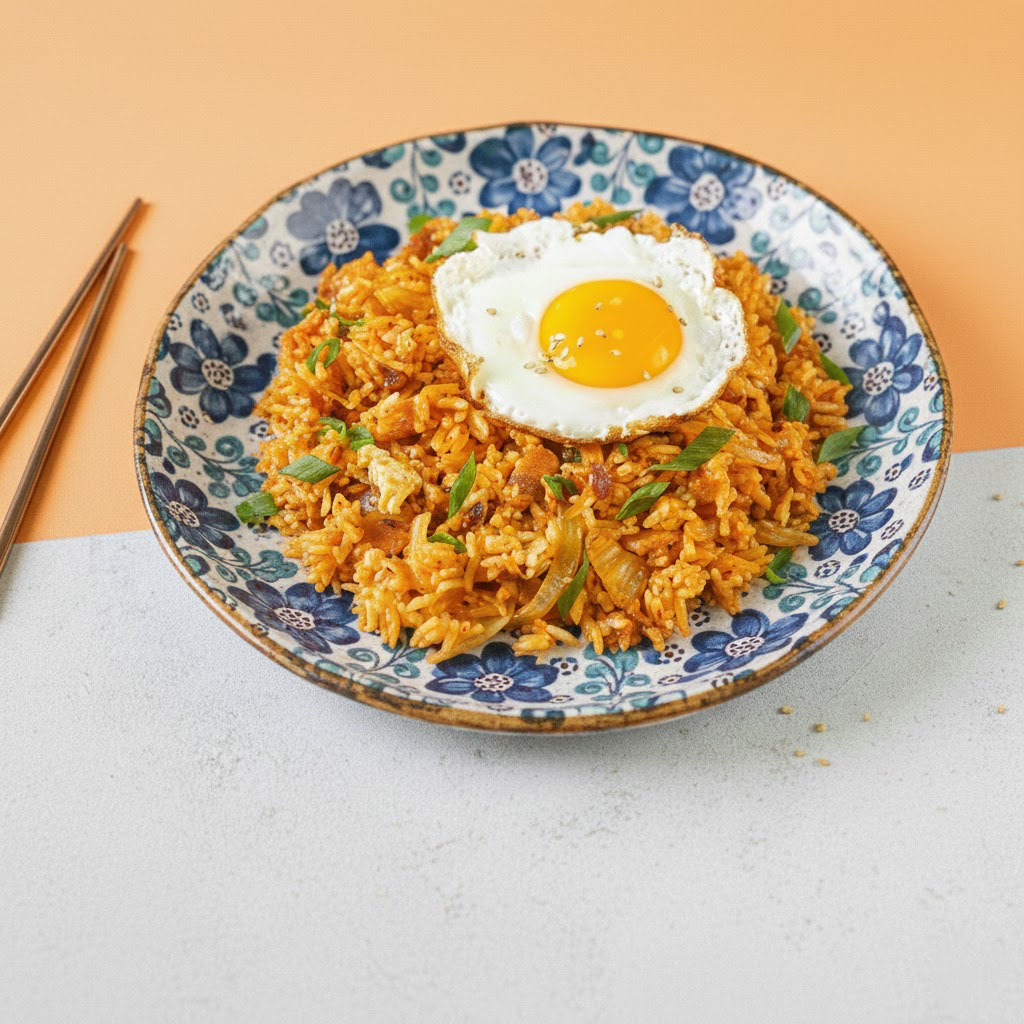 Un festín reconfortante donde el arroz salteado se empapa de la esencia ácida y picante del kimchi, creando un plato vibrante que se vuelve irresistible con el toque cremoso de una yema de huevo.